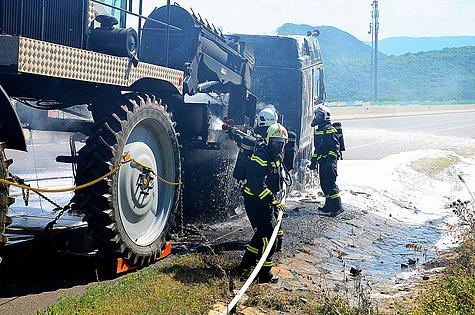Sofort wurde ein umfassender Angriff mit drei Schaumrohren und 2 C-Rohren gestartet. Aufgrund der starken Rauchentwicklung mussten die Löscharbeiten teilweise unter umluftunabhängigem Atemschutz erfolgen. Während der Löscharbeiten war die gesamte Autobahn, Fahrtrichtung Westen, für eine Stunde gesperrt.