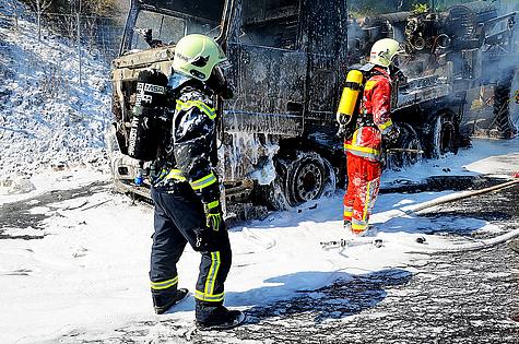Der teilweise abgebrannte Tieflader wurde durch eine Fachfirma von der Autobahn gebracht. Insgesamt waren 8 Fahrzeuge mit 33 Mann im Einsatz.