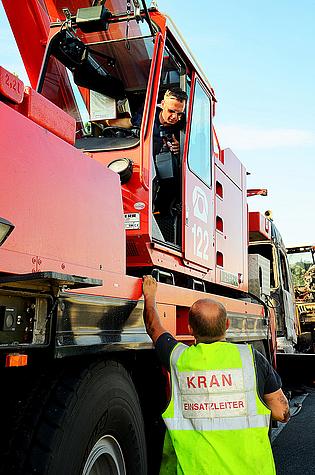 Das Zugfahrzeug wurde zuerst mit der Seilwinde des Kranfahrzeuges vom Tieflader weggezogen und anschließend für das Verladen auf einen Ersatztieflader um 180 Grad gedreht. Der Hebevorgang erforderte ein hohes Maß an Fingerspitzengefühl, welches der Kranfahrer bewies.