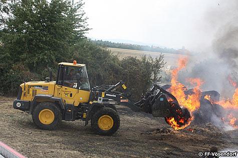 Anschließend wurde von der Marktgemeinde Vösendorf ein Radlader angefordert, um die Strohballen zerteilen und besser ablöschen zu können. Währenddessen wurde die Löschwasserversorgung mit einer 200 Meter langen Zubringleitung sichergestellt.