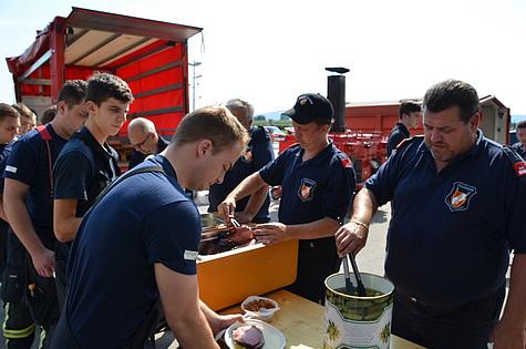 Im Anschluss an die Übung folgten ein Gruppenfoto der 154 Feuerwehrmitglieder und ihrer Fahrzeuge sowie die Meldung der positiv absolvierten Übung durch den Bereitschaftskommandanten an Bezirksfeuerwehrkommandant LFR Ing. Richard Feischl. Danach wurden alle Mitglieder von der Versorgung 14 schmackhaft verköstigt.