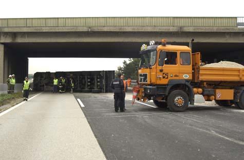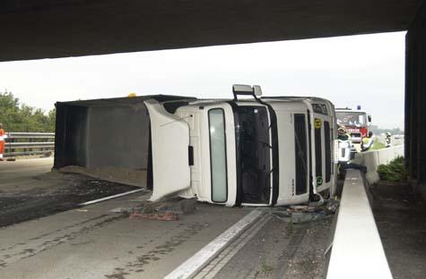 Bei der Auffahrt Baden ist ein mit Schotter beladener Lkw ins Schleudern geraten. Das Fahrzeug kollidierte zunächst mit der rechten Leitschiene und stürzte dann quer über alle Fahrspuren unter einer Brücke um.