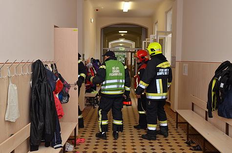Zur Erkundung innerhalb des Gebäudes rüsteten sich mehrere Atemschutztrupps mit Mehrgasmessgeräten aus und betraten die Schule. Als Erstmaßnahme wurden die Gasleitungen geschlossen, alle Klassenräume kontrolliert sowie mit umfangreichen Lüftungsmaßnahmen begonnen.