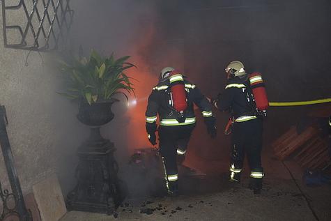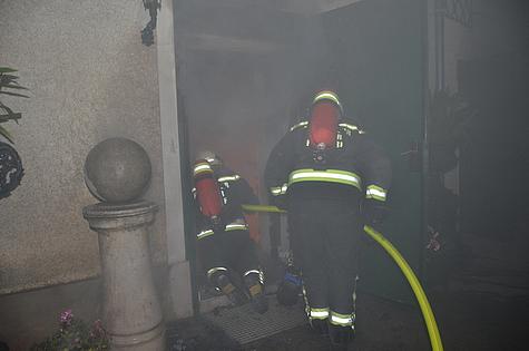 Bei Ankunft des ersten Tanklöschfahrzeuges am Einsatzort schlugen den Feuerwehrmännern bereits meterhohe Flammen aus der Eingangstür des Nebengebäudes entgegen.