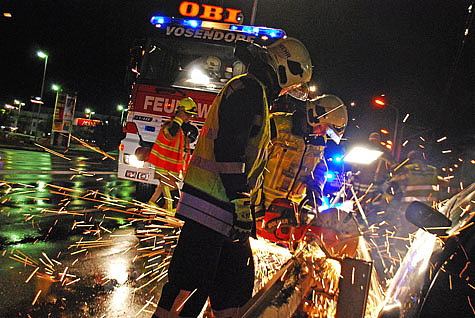 Die demolierte Leitschiene musste mit einem Trennschleifer durchtrennt werden. Nach über zwei Stunden konnten die 12 Mann und 3 Fahrzeuge wieder ins Feuerwehrhaus einrücken.