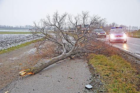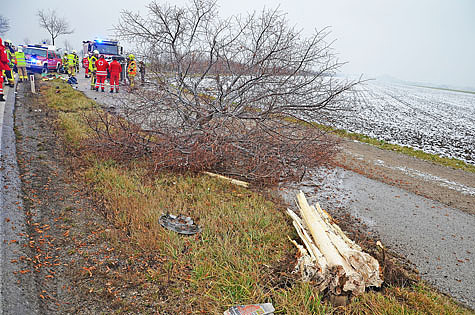 PKW entwurzelt Baum - Fahrer eingeschlossen