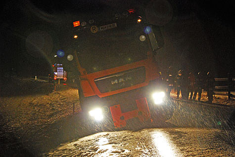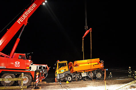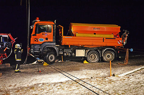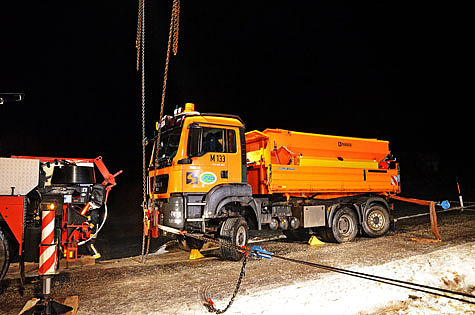 Mittels Kettengehänge konnte anschließend das Streufahrzeug angehoben und auf der Fahrbahn abgestellt werden. Nach erfolgreicher Bergung wurden am LKW Ketten aufgezogen, um eine sichere Weiterfahrt zu ermöglichen.
