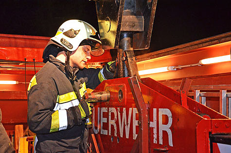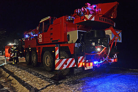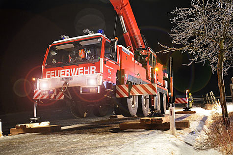 Die Kranbesatzung brachte gemeinsam mit den Feuerwehrmitgliedern aus Sulz und Sittendorf die Abstützung sowie den Lastgalgen in Stellung.