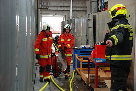 Beim Öffnen der Kellertüre war bereits dichter Rauch vorhanden und ein Feuerschein zu sehen. Sofort wurde über die Bezirksalarmzentrale die Alarmstufe auf "B4 Industriebrand" erhöht. Die Evakuierung der rund 180 MitarbeiterInnen funktionierte durch die Firmenleitung vorbildhaft.
