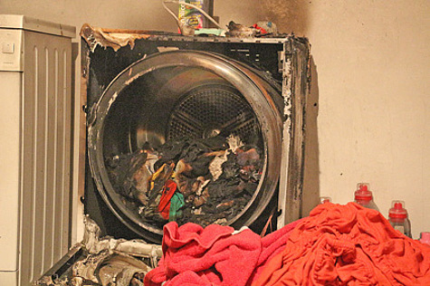 In einem Kellerraum fanden die Feuerwehrmänner einen brennenden Wäschetrockner vor und begannen diesen zu löschen.