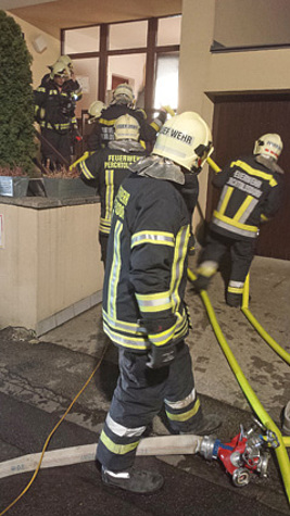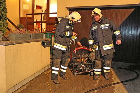 Einsatzleiter HBI Wilhelm Nigl entschied daher, einen Atemschutztrupp mit einer gefüllten C-Löschleitung in den Kellerbereich zu schicken.