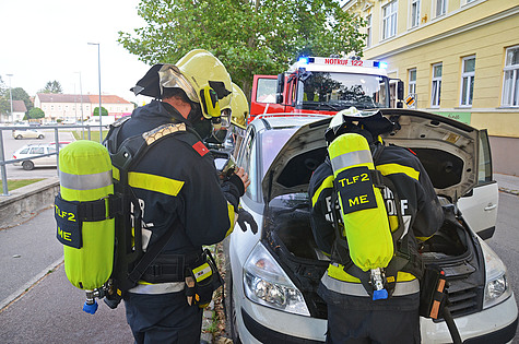 Am 7. Juli 2014 bemerkte ein Autolenker während seiner Fahrt durch Maria Enzersdorf , dass sein PKW plötzlich sehr schwer lenkbar ist. Er stellte das Kraftfahrzeug daher sofort in die nächste Parkplatzbucht der Josef Leeb Gasse und merkte in diesem Moment, dass Rauch aus dem Motorraum dringt. Über sein Mobiltelefon wählte er den Feuerwehr Notruf. Die Feuerwehr Maria Enzersdorf wird um 19.47 zu diesem Einsatz alarmiert. Ein Atemschutztrupp öffnet die Motorhaube und beginnt mit den Kühlarbeiten. Währenddessen teilte der Autobesitzer dem Einsatzleiter BI Girts Hartmanis mit, dass die Feuerwehr Maria Enzersdorf bereits zum zweiten Mal innerhalb von einem Jahr sein Kraftfahrzeug löscht. Nach einer halben Stunde Kühlung des stark überhitzten Motorraums, unter ständiger Kontrolle mittels Wärmebildkamera, konnte der Einsatz beendet werden. Die Ursache für diesen zweimaligen Vorfall innerhalb von einem Jahr ist nicht bekannt. Der Besitzer meinte, er wird sich nun ein neues Auto kaufen.