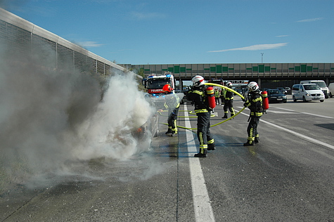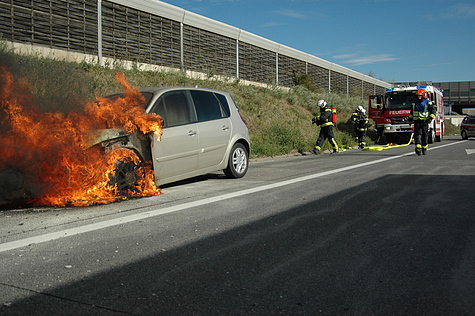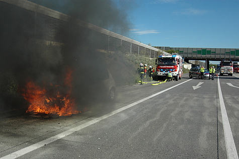 Die Bezirksalarmzentrale alarmierte um 16:40 Uhr die Freiwillige Feuerwehr Wiener Neudorf zum Brandeinsatz. Bereits beim Ausrücken konnte die Rauchsäule wahrgenommen werden. Vor Ort stand das Auto im Motorbereich in Vollbrand. Auch der angrenzende Lärmschutzwall war teilweise in Brand geraten. Unter Atemschutz und Vornahme eines C-Rohres vom HLF Wiener Neudorf konnte der Brand schnell unter Kontrolle gebracht werden. Zusätzlich wurde über den Frontwerfer vom GTLF Wiener Neudorf die Wiese abgelöscht. Aufgrund des dichten Brandrauches kam es kurzfristig zu Sichtbehinderungen auf der Autobahn. Das ausgebrannte Fahrzeug wurde mit dem ASP Wiener Neudorf von der Autobahn verbracht und gesichert abgestellt. Nach rund 45 Minuten konnten die 17 Mitglieder mit deren vier Fahrzeugen wieder ins Feuerwehrhaus einrücken.Bildautor: FF Wiener Neudorf & Herbert Wimmer/Pressestelle BFK Mödling