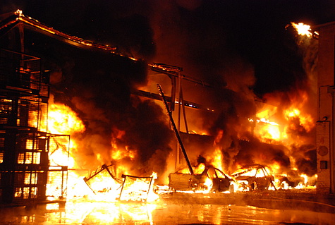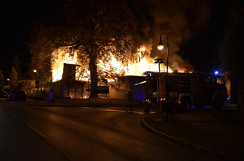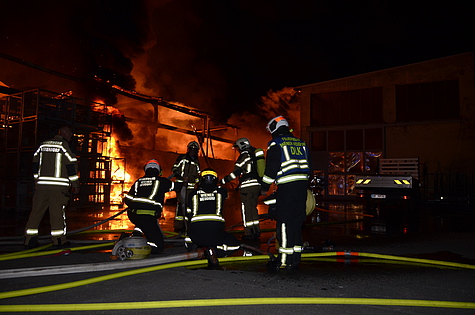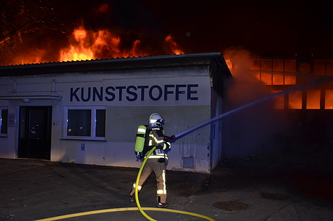 Trotz Dunkelheit konnte schon beim Ausrücken eine große Rauchsäule wahrgenommen werden. Am Einsatzort angekommen, wurde das Ausmaß des Brandes erst richtig sichtbar. Eine Fertigungshalle von rund 1.000 m² für sämtliche Kunststofffertigungen stand in Vollbrand.