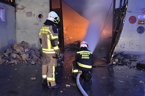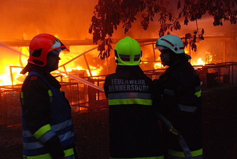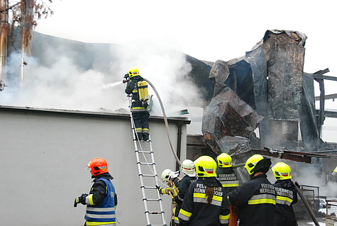 Sofort wurde von Einsatzleiter HBI Friedrich Flasar die Alarmstufe erhöht und die Feuerwehren Hennersdorf und Wiener Neudorf zum Brandeinsatz hinzugezogen. Als Erstmaßnahme wurde Steig Vösendorf in Stellung gebracht um mit dem Wasserwerfer von oben herab mit den Löschmaßnahmen zu beginnen.
