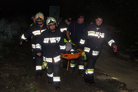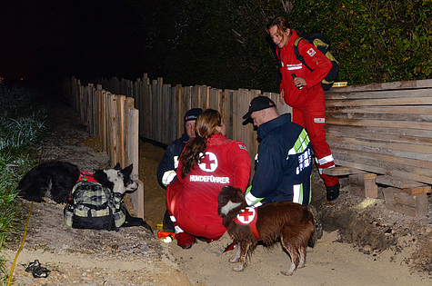 Gemeinsam mit ihrer Hundeführerin Cornelia Rybar und einem Team der Feuerwehr wurde die hilflose Dame medizinisch erstversorgt und in eine warme Feuerwehrjacke der Retter gepackt. Mit Hilfe einer Rettungswanne wurde die abgängige Frau im Anschluss durch die Feuerwehr über eine Behelfsbrücke ans andere Ufer getragen und an den ebenfalls anwesenden Rettungsdienst des Roten Kreuzes übergeben.