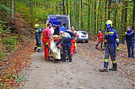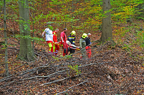 Über einen Forstweg konnte man bis zu einer Gabelung fahren. Die restliche Strecke musste zu Fuß bewältigt werden. Nach der Erstversorgung der verletzten Person wurde diese händisch aus dem fünf Meter tiefen Graben herausgehoben und durch den Wald zu dem Rettungsfahrzeug gebracht. Anschließend konnte der Patient aus dem Wald zu dem Rettungshubschrauber transportiert werden.