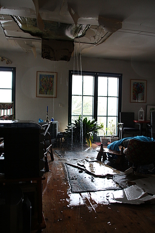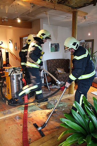 An der Einsatzstelle angekommen, stellte Einsatzleiter BI Girts Hartmanis fest, dass die Deckenkonstruktion, im Wohnzimmer, eines Ferienhauses eingestürzt ist und Wasser vom 1. Stock hinunterläuft.