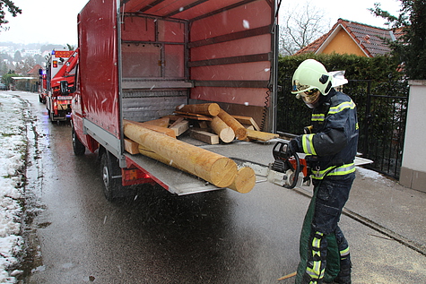 In weiterer Folge wurden die Rundhölzer, im Gefahrenbereich, in Stellung gebracht und mit Klampfen und Nägel befestigt. Danach wurde das ausgelaufene Wasser mittels Wassersauger entfernt.