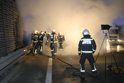 Zur Unterstützung wurde ein weiteres C-Rohr unter Atemschutz eingesetzt und die Löschmaßnahmen durch Messungen mit einer Wärmebildkamera gezielt durchgeführt. Die anfängliche Rauchentwicklung war derartig stark, dass kurzzeitig die komplette Richtungsfahrbahn gesperrt werden musste.