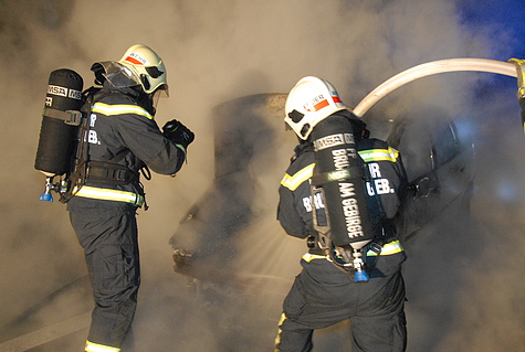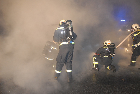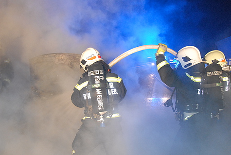 FF Brunn mit zwei C-Rohren unter Atemschutz im Einsatz