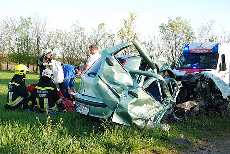 Beim Eintreffen der Einsatzkräfte stand ein Volkswagen auf der Straße und ein völlig zerstörter Fiat lag im Straßengraben, in welchem ein Mann eingeklemmt war. Die Mannschaft des Rüstlöschfahrzeuges Achau schaffte es, den Lenker händisch zu befreien.