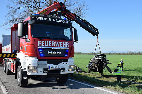 Für die Bergung des Fiats wurde das Wechselladefahrzeug Wiener Neudorf nachalarmiert. Nach über zwei Stunden konnten sämtliche Einsatzkräfte unter der Einsatzleitung von OBI Franz Winkler wieder einrücken.