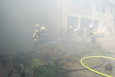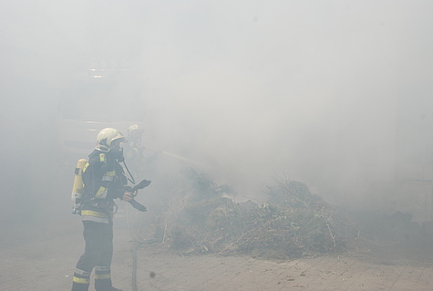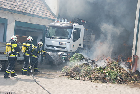Beim Eintreffen der Einsatzkräfte am Wirtschaftshof stand der Grünschnittabfall in Brand und drohte auf einen LKW sowie das Gebäude überzugreifen. Ein Atemschutztrupp begab sich sofort mit einem HD-Rohr zum Schutz des Lastwagens vor.