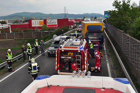 Bis zum Eintreffen des Roten Kreuzes wurden die Insassen des silbernen BMW durch Feuerwehrsanitäter erstversorgt. Parallel dazu wurde ein zweifacher Brandschutz aufgebaut sowie die ausgeflossenen Betriebsmittel gebunden.