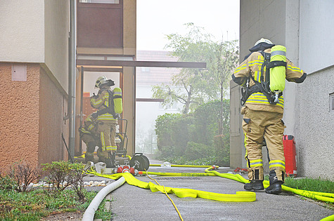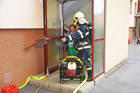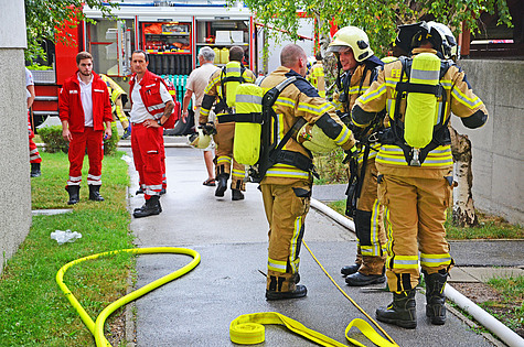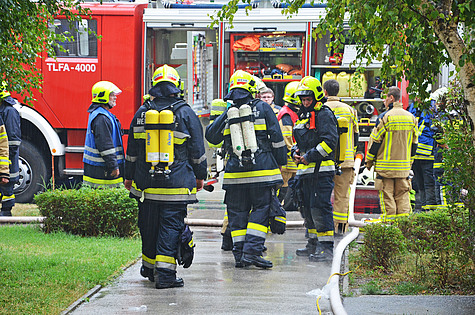 Die Feuerwehr Vösendorf begann mit der Menschenrettung und parallel mit der Brandbekämpfung im Keller. Die Bewohner wurden mittels Fluchtfiltermasken durch Atemschutzgeräteträger ins Freie gebracht. Im Keller fanden die Feuerwehrmänner ein Kellerabteil im Vollbrand vor. Die Löscharbeiten gestalteten sich aufgrund der nicht vorhandenen Sicht und der extremen Hitze sehr schwierig.