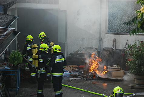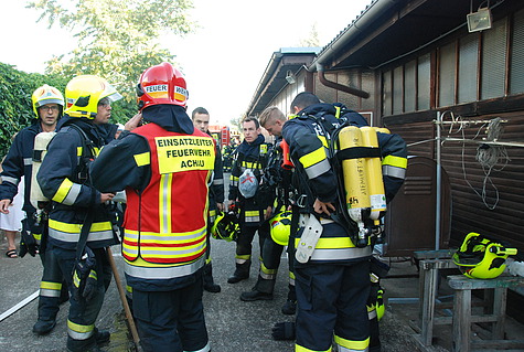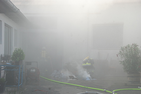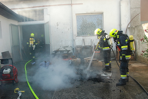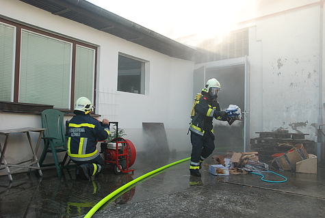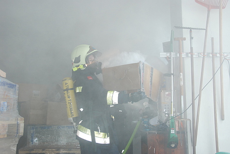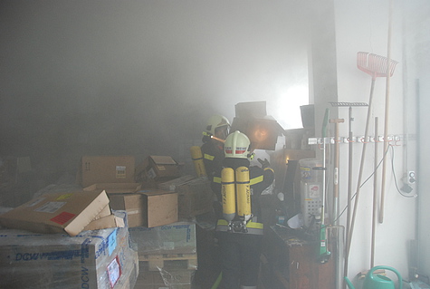 Obwohl der Besitzer erste Löschmaßnahmen mit einem Gartenschlauch unternommen hatte, begab sich ein Atemschutztrupp mit einem C-Rohr in die Halle. Dort wurden einige Kisten mit Pflegeartikeln in Brand vorgefunden.