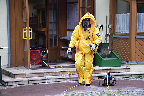Es wurde entschieden, das Schadstofffahrzeug der Feuerwehr Wiener Neudorf zur Einsatzstelle zu beordern, um Schutzanzüge der Stufe III vor Ort zu haben. Inzwischen wurde ein Be- und Entlüftungsgerät in Stellung gebracht, um die Dämpfe aus dem Kellerbereich abzusaugen.