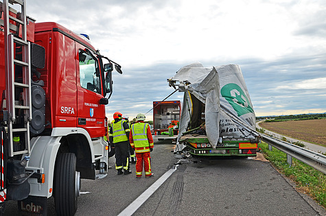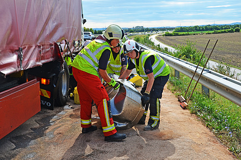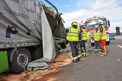 Da die Bordwände des verunfallten Sattelaufliegers komplett instabil waren, mussten diese mit mehreren Zurrgurten gesichert werden. Herausragende Metallteile wurden mit der hydraulischen Rettungsschere abgeschnitten.