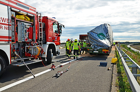 Bereits wenige Minuten später trafen die Einsatzkräfte der Freiwilligen Feuerwehr Wiener Neudorf an der Unfallstelle ein. Sofort wurden Absicherungsmaßnahmen durchgeführt sowie der Brandschutz aufgebaut.