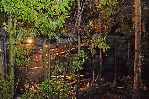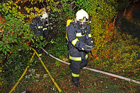 Sofort wurde der Zugang zu dem Brandobjekt, der durch einen Drahtzaun blockiert war, mit einem Bolzenschneider durchtrennt und die Brandbekämpfung mit einem C-Rohr unter Atemschutz begonnen.