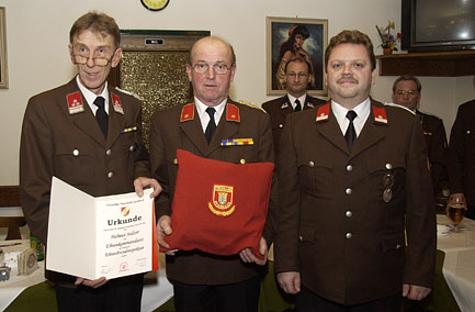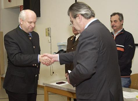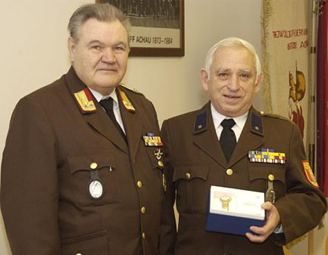 In den Feuerwehr-Ruhestand trat gleichzeitig der Leiter des Verwaltungsdienstes der FF Achau, V Johann Sellinger. 28 Jahre lang hat er diese wichtige Funktion inne gehabt, mehr als eine Million Euro an Feuerwehrfinanzen sind in dieser Zeit durch seine sorgsamen Hände gegangen. Brandrat Karl Blieberger überreichte dem scheidenden Verwalter als Abschiedgeschenk eine goldene Uhr mit Gravur.