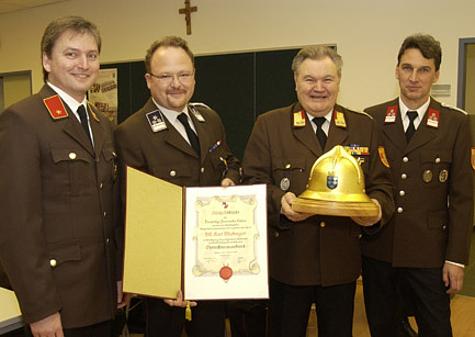 Als seine erste Tätigkeit als neuer Kommandant stellte der neugewählte Kommandant den Antrag, BR Karl Blieberger zum Ehrenkommandanten der FF Achau zu ernennen. Dieser Antrag wurde einstimmig und mit Standing Ovations für den ehemaligen Kommandanten angenommen. Als sichtbares Zeichen wurde ihm nicht nur eine Urkunde, sondern auch der Goldene Helm der FF Achau verliehen - es ist jener vergoldeter Helm, den BR Blieberger mehr als zwei Jahrzehnte im Feuerwehrdienst getragen hat.