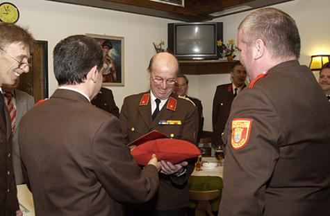 An Bürgermeister Ing. Johannes Unterhalser, der an diesem Abend gewissermaßen im Kreise "seiner" Feuerwehr Geburtstag feierte, überreichte Kommandant OBI Valenta zu Beginn der Mitgliederversammlung ein Geburtstagsgeschenk.