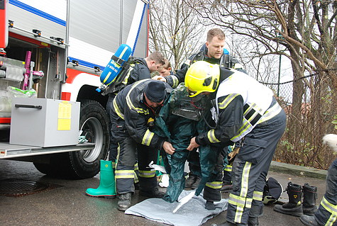 Die zerbrochene Flasche wurde in einen Kübel gegeben und ins Freie gebracht. Zusätzlich wurde im Keller ein Bindemittel aufgetragen, um die ausgelaufene Flüssigkeit binden zu können. Die Messungen im Freien ergaben, dass es sich um Ammoniak handelt.
