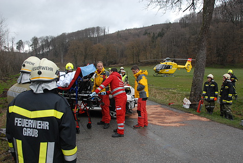 Die Angaben für die Feuerwehr deuteten auf eine Einklemmung beider Personen im Unfallfahrzeug hin, daher wurden gemäß Alarmplan von der Bezirksalarmzentrale die Freiwilligen Feuerwehr Grub, Sulz, Dornbach und Sittendorf alarmiert. Die ersteintreffende Feuerwehr war Grub, welche gemeinsam mit dem Roten Kreuz die ersten Maßnahmen zur Betreuung der verletzten Pkw-Insassen setzte.