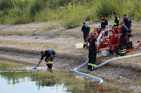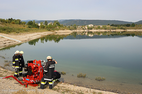 Um genügend Löschwasser zur Verfügung zu haben, wurden am etwas abgelegen Schotterteich die SPA 200 der Feuerwehren Perchtoldsdorf und Achau in Stellung gebracht.