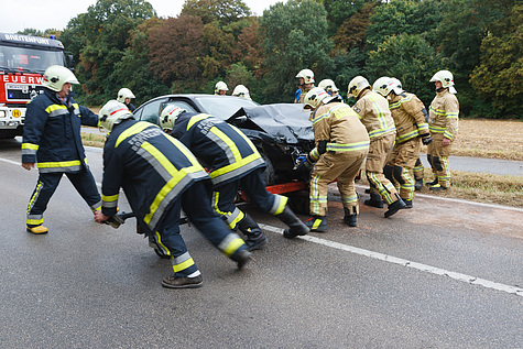 Der PKW wurde händisch auf die Räder gestellt, mitttels Seilwinde des SRF aus dem Graben gezogen, mit der Abschleppachse an einen von der Polizei benannten Platz verbracht und dort gesichert abgestellt.