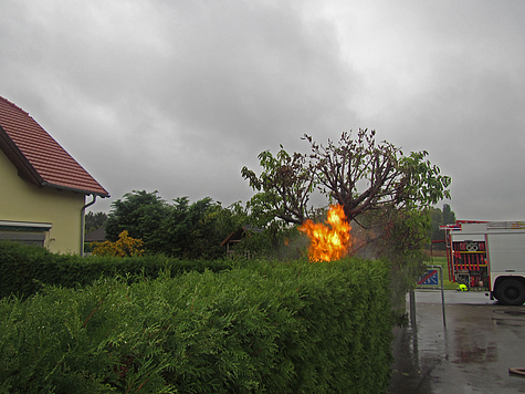 Seitens Einsatzleitung wurde entschieden, das ausströmende Gas, bis zur Abschaltung durch den Energieversorger, kontrolliert abbrennen zu lassen. Vorsorglich wurden zum Schützen der Umgebung (Hecken, Bäume und Zäune) zwei C-Rohre in Stellung gebracht.
