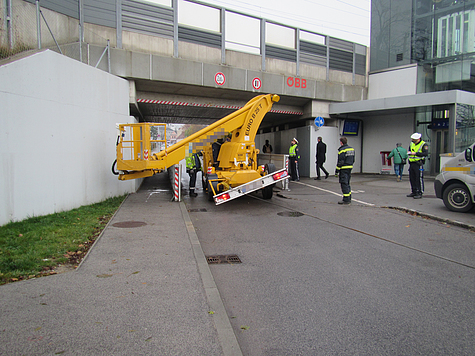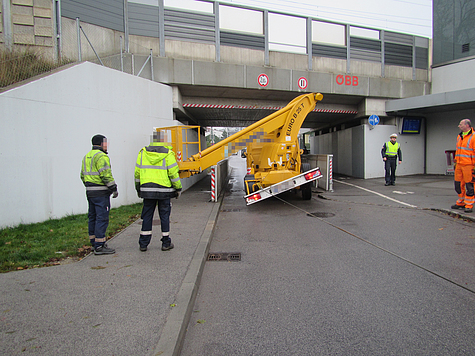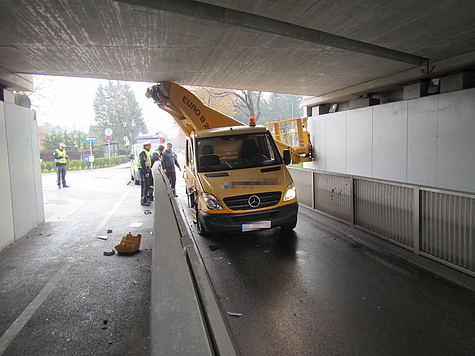 Der Lenker eines Fahrzeuges mit Teleskopmastaufbau unterschätzte am Vormittag des 2016-11-17 die Höhe seines gemieteten Klein-LKW und blieb in der Eisenbahnunterführung in der Bahnstraße stecken.