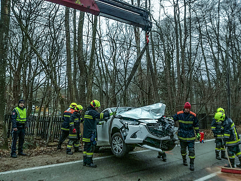Nach der Unfallaufnahme durch die Polizei konnte mit der Fahrzeugbergung begonnen werden. Dazu wurde das SRF der Feuerwehr Sittendorf in Stellung gebracht, das erste Fahrzeug angehoben und vorerst seitlich abgestellt werden.