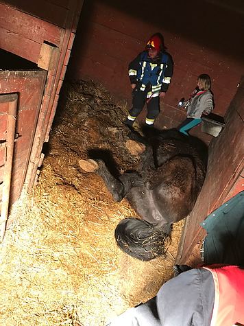 Durch setzen einer Umlenkrolle im Dachbereich und Zug durch Manneskraft mit einem Seil, konnte das Pferd wieder auf die Beine gestellt werden.