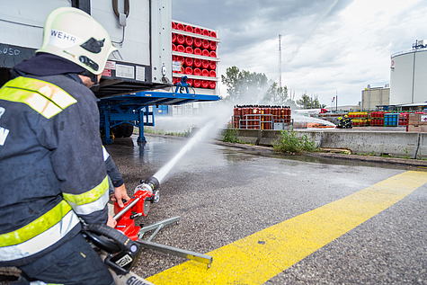 Die örtlich zuständige Feuerwehr Gumpoldskirchen wurde von den Feuerwehren Guntramsdorf und Mödling unterstützt. Es galt die Wasserversorgung an der Einsatzstelle über mehrere Zubringleitungen sicherzustellen, da die Einsatzstelle von mehreren Seiten und zusätzlich über einen Hubsteiger mit Wasser beaufschlagt wurde. Dadurch konnte verhindert werden, dass weitere Flaschenbündel in der Nähe des Brandes aufgeheizt werden. Die brennenden, beschädigten Flaschen selbst ließ man kontrolliert ausbrennen. In der ersten „heißen“ Phase wurden mehr als 8.000 Liter Wasser pro Minute zum Kühlen aufgebracht.