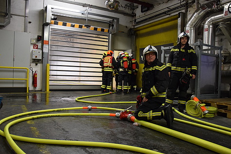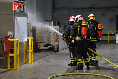 Aus diesem Grunde wurde die bereits hergestellte C-Löschleitung zur Kühlung des Behälters in Betrieb genommen, parallel dazu wurde der Rauch- und Wärmeabzug in der Halle ausgelöst sowie ein Hochleistungslüfter in Stellung gebracht.