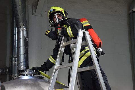 Bei Ankunft der beiden Hilfeleistungsfahrzeuge und der Drehleiter am Einsatzort wurde der Einsatzleiter darüber informiert, dass sich ein Edelstahlbehälter einer Absauganlage stark erhitzt haben soll. Erste Messungen mittels Wärmebildkamera bestätigten dies – an der Außenseite des Behälters konnten über 265 Grad Celsius gemessen werden.