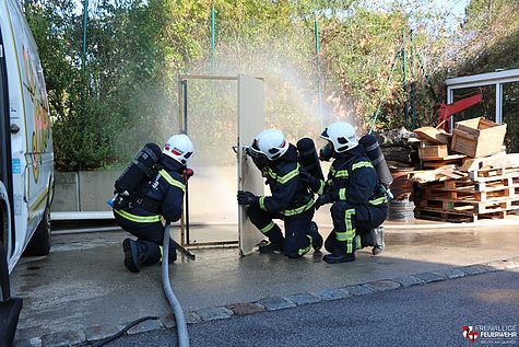 Jeweils ein Trupp begab sich mit einem Ausbildner über den engen Treppenabgang mit einer C-Leitung ins Innere des Brandobjektes. Gleich neben den Stiegen wurde eine in Brand stehende Rohrleitung vorgefunden, welche es abzulöschen und zu schließen galt. Im Anschluss wurde eine geschlossene Tür erreicht welche in der zuvor beübten Taktik zu öffnen war. Im dahinter befindlichen Raum stand eine Couch sowie ein verschlossener Kleiderkasten in Vollbrand. Während dem Ablöschen dieser beiden Objekte kam es zu einer Rauchgasdurchzündung, einem sogenannten Flash-Over, welchen es galt zu bekämpfen und gleichzeitig den sofortigen Rückzug zu anzutreten. Anschließend wurde der Raum wieder betreten und die beiden Brandobjekte endgültig abgelöscht. Dieses Szenario wurde von jedem Trupp dreimal durchgespielt, damit jede(r) Teilnehmer(in) alle Positionen im Trupp üben kann. Nach rund 20 Minuten konnten alle Teilnehmer(innen) erschöpft den Container verlassen.